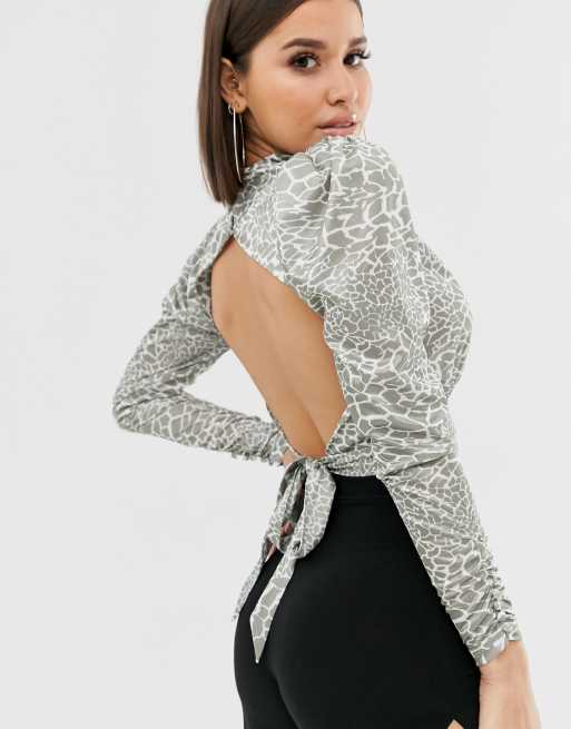 Asos Design Cowl Neck Long Sleeve Backless Top In Animal Asos
