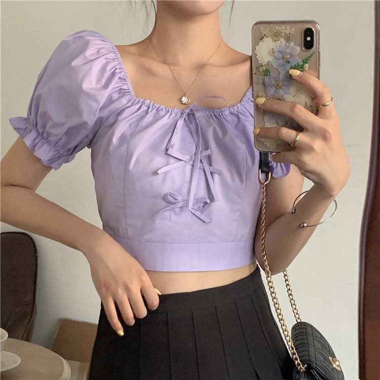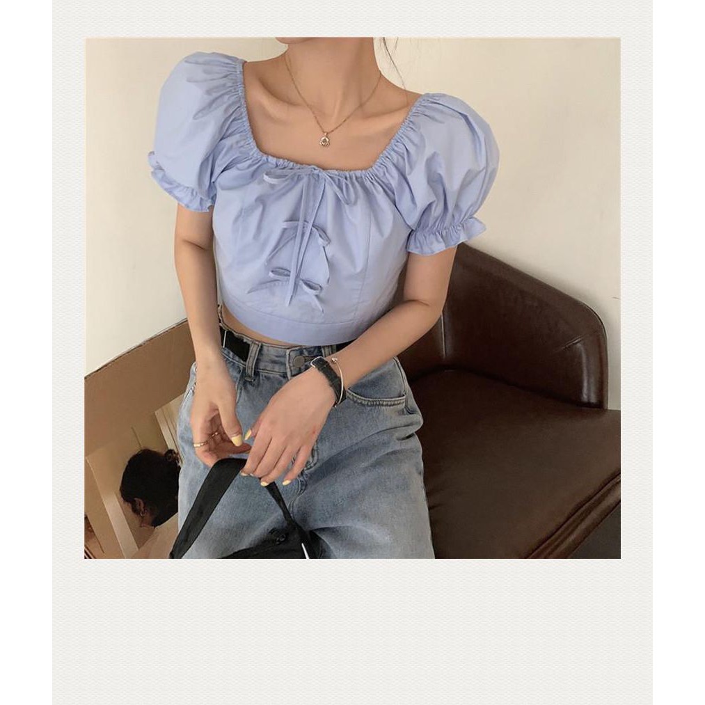 Blus Crop Top Wanita Lengan Pendek Balon Hiasan Pita Atasan Import Gaya Korea 1011 Shopee Indonesia