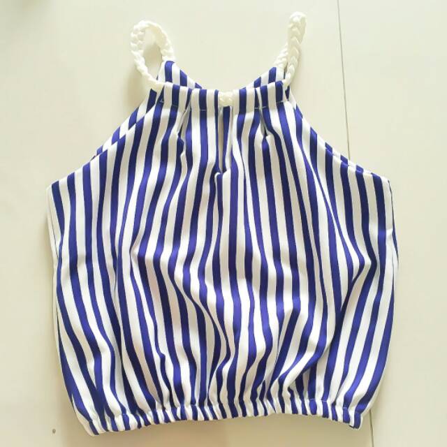 Cizgili Balon Kollu Beyaz Crop Top Mavi