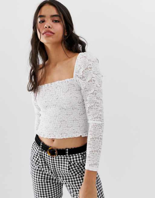 Bershka Shirred Lace Square Neck Top In White Asos