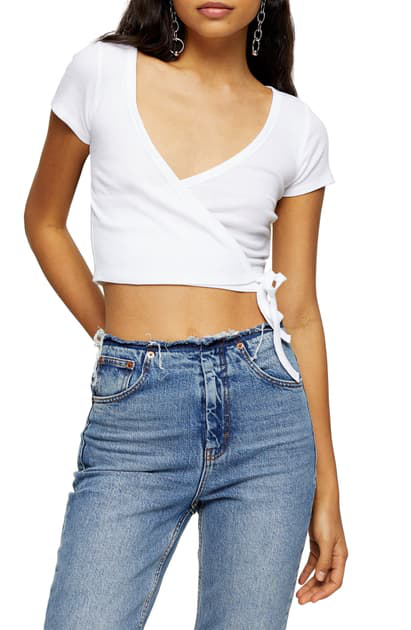 Topshop Ballet Ribbed Wrap Crop Top In White Modesens