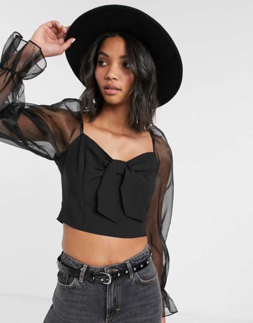 Topshop Crop Top With Organza Puff Sleeves In Black Asos