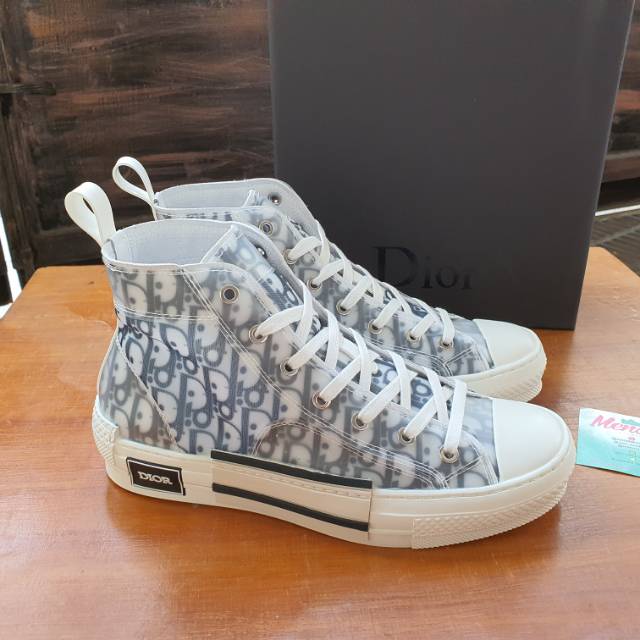 The b23 high top sneaker is set apart by its white and black dior oblique motif and transparent paneling. The sneaker is further enhanced with contrasting details on the sides including a dior signature and. Black and white dior oblique canvas with dior and shawn bee embroidery patch. Set apart by modern design details the shoe maintains timeless sneaker codes such as eyelets and a lace up front a white rubber sole a reinforced round toe and a rear heel tab.