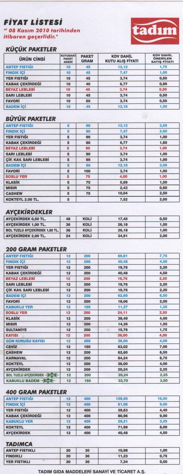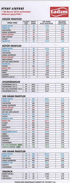Tadim Kuruyemis 8 Kasim 2010 Toptan Perakende Fiyat Listesi Market Kuruyemis