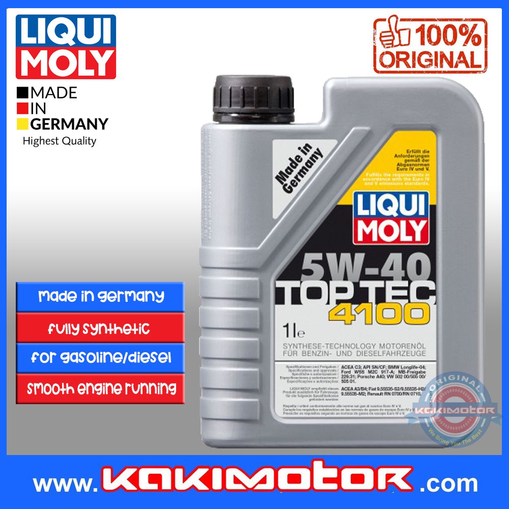Top tec 4100 5w 40. 5 l canister plastic. Liqui moly recommends this product for vehicles that needs to comply the following specifications. Liqui moly top tec 4100 5w 40 engine oil 1 liter.