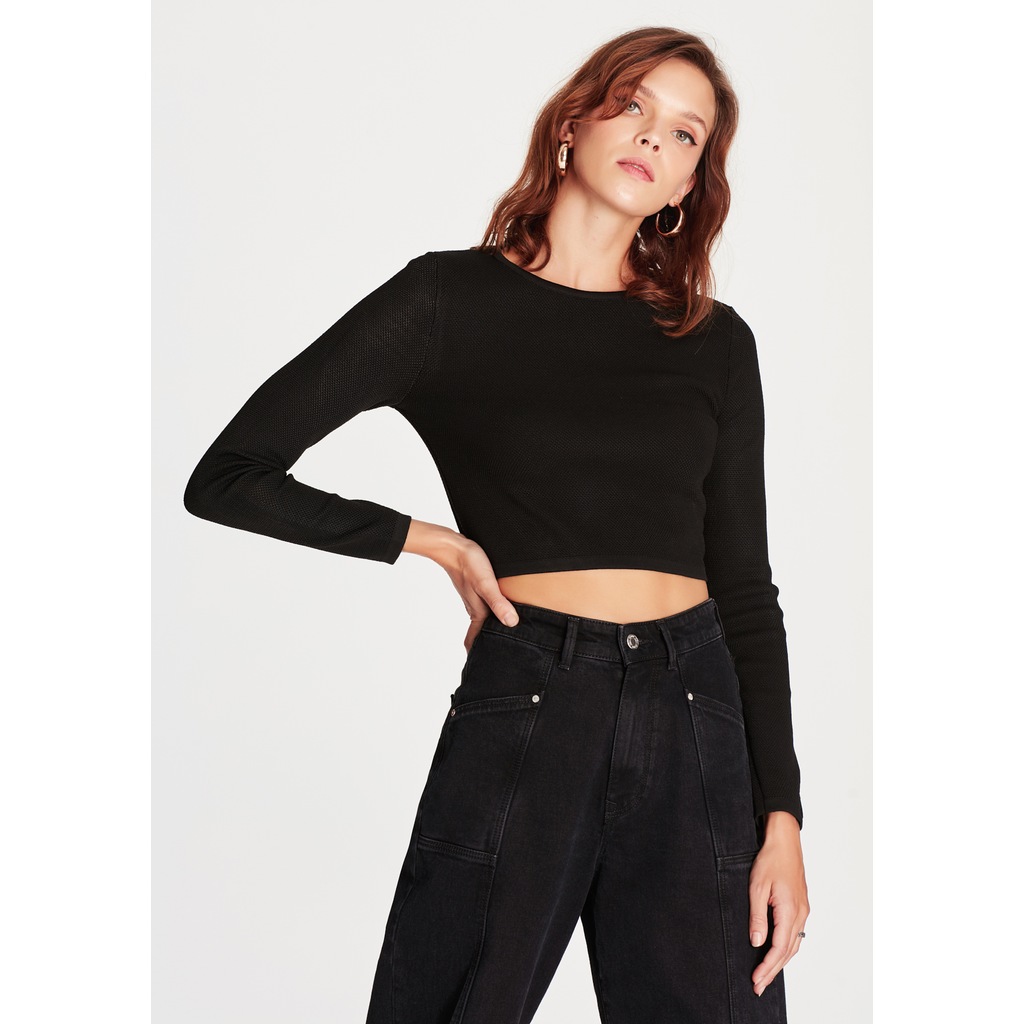 3529 Havuz Yaka Uzun Kollu Crop Top Siyah Bluz Dilvin